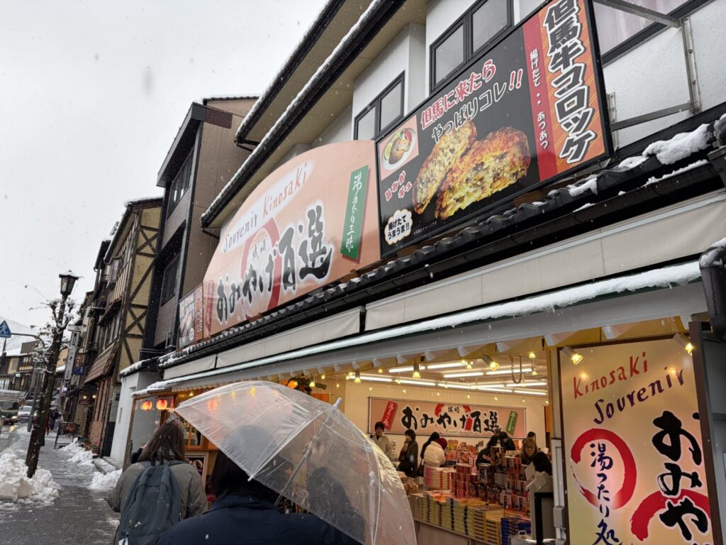 城崎温泉は食べ歩きができるお店やレストランなどがたくさんあるので、雪景色を楽しみながら街歩きを楽しめます。