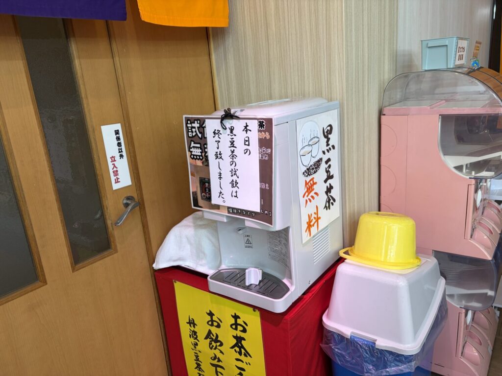 黒豆茶が無料でいただけます。また、奥の方には座る場所もあったので、時間調整として最後にこちらに立ち寄るのもいいかもしれませんね。