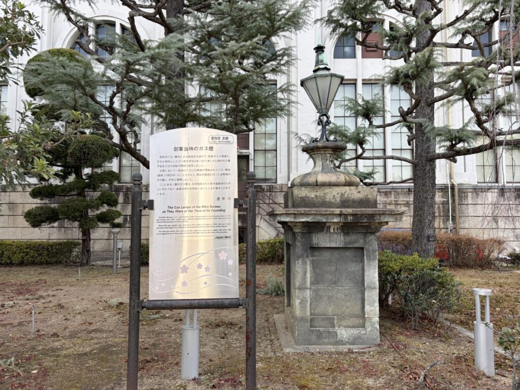 構内で石炭ガスを製造しており、そのガスを使用したガス燈が局内のあちこちで使われていたようです。大阪でガスが普及したのは明治38年に入ってからだったそうなので、明治4年に灯ったガス燈はかなり先進的だったようです。現代は電気のあかりが一般的なので、ガス燈も珍しいものになりましたよね。