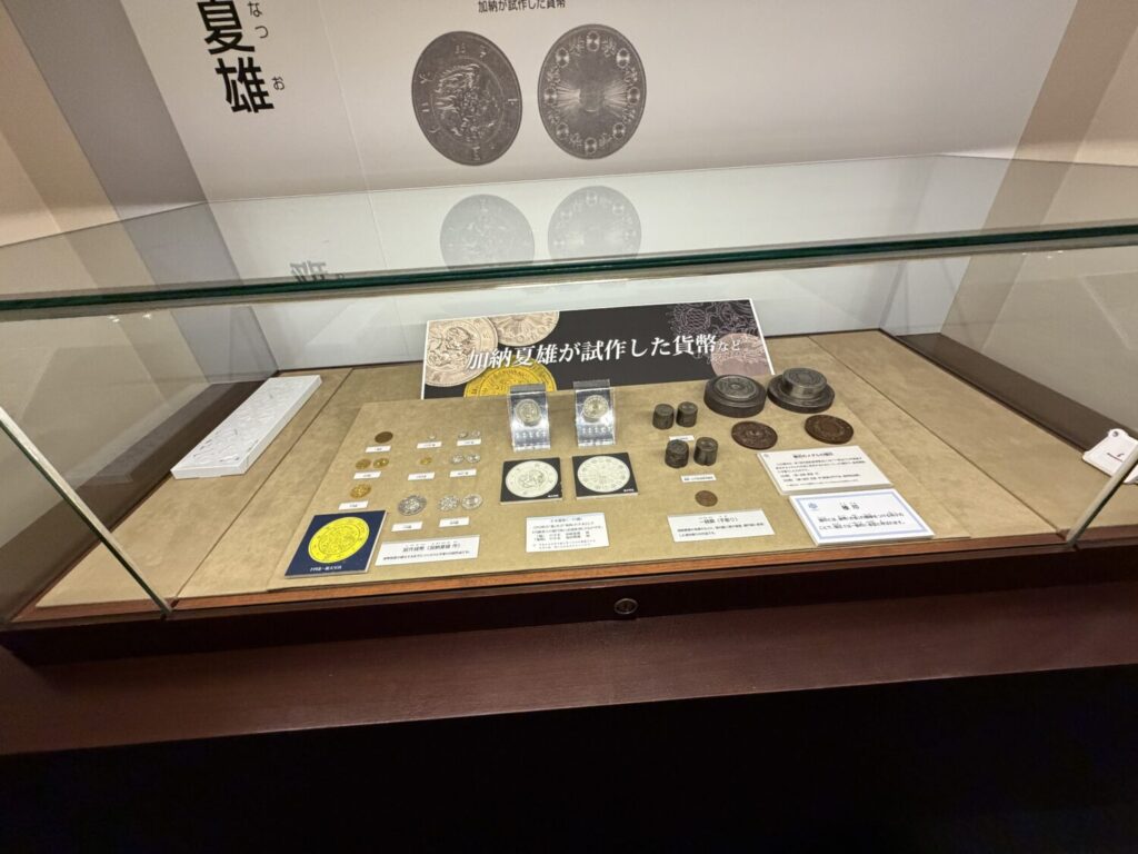 明治に入ってから、日本銀行が発行する貨幣を大量に製造するため、たくさんの試作が作られました。こちらは幕末から明治にかけて活躍した金工師である加納夏雄氏が試作した貨幣の数々。加納夏雄氏は「超絶技巧」という技を持ち、明治政府に新貨幣の意匠制作を任された人物。貨幣の緻密な模様はこうやって作られたのですね。