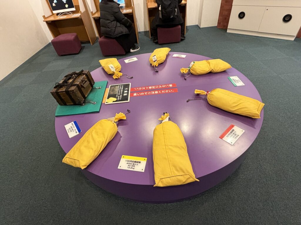 こちらはリアルなお金の重さを感じられるコーナーです。貨幣で何万円分となれば、実際にどれぐらいの量になり、どれぐらいの重さになるのかがよくわかります。硬貨で大金を持つなんてなかなかないことなので、実際に持ってみて、その重さを実感。紙幣がいかに軽いかがよくわかります。きっと持ち運びも考えて、大きなお金は紙幣になっているのでしょうね。