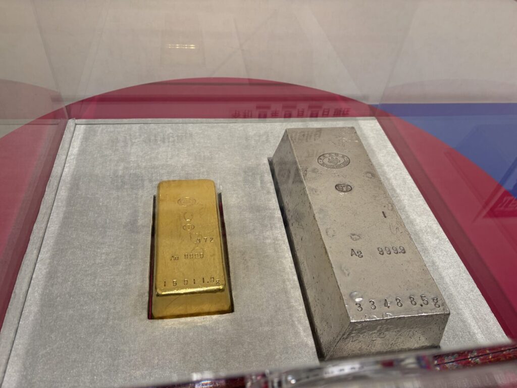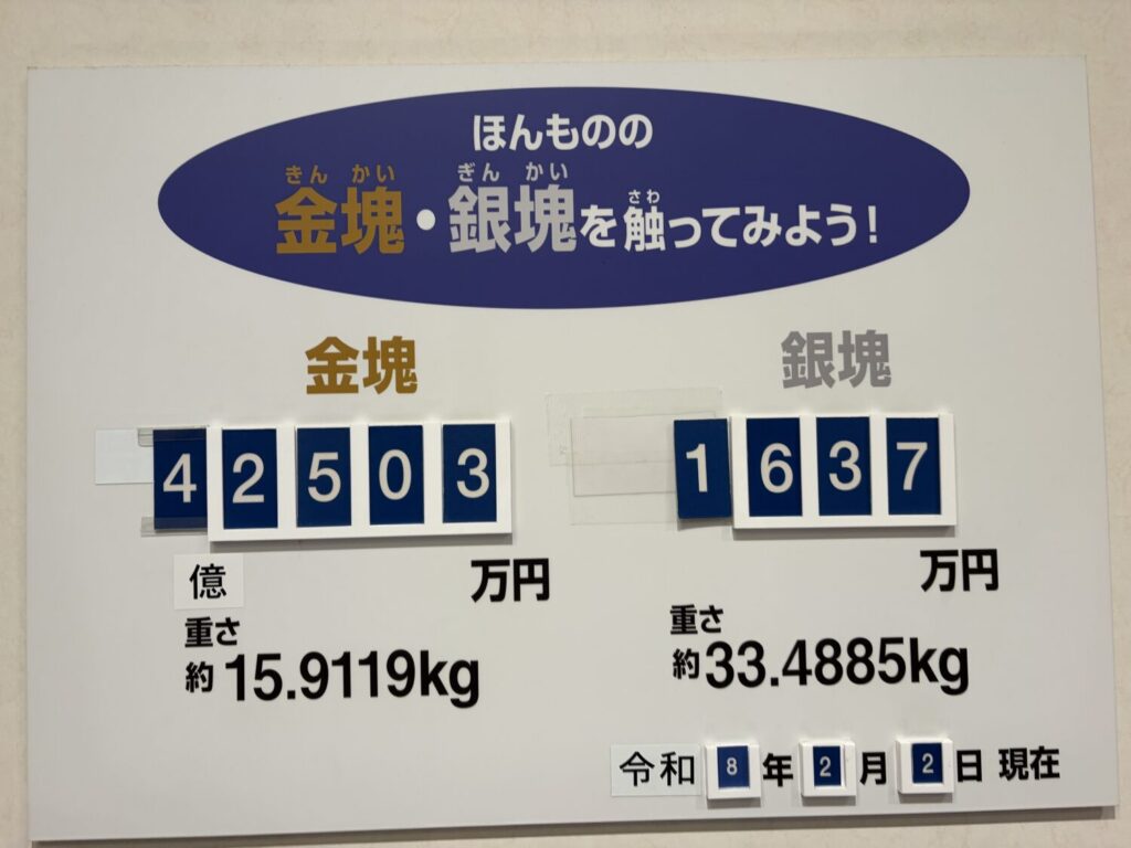 こちらは金塊と銀塊です。大きさも重さも違うのに、銀はこれだけ大きくても金よりずっと価値が低いんです。知っていたことでもこうやって現物で比較されると、リアリティを感じますね。