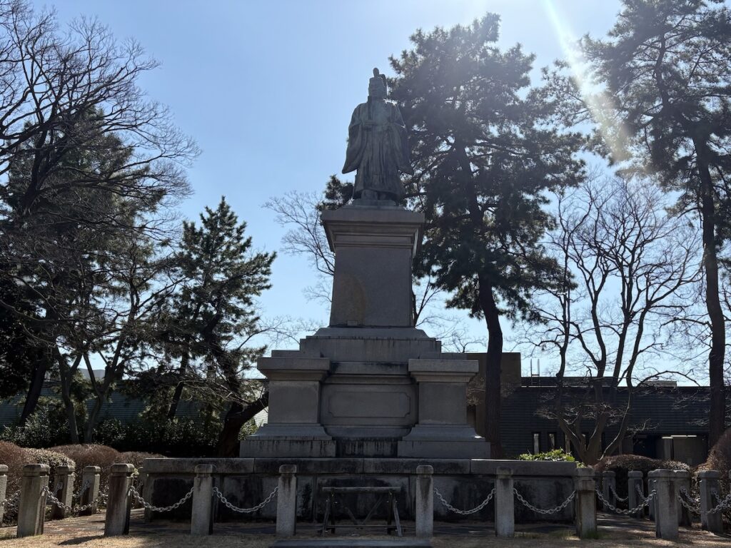 遊具が置かれた広場や池のある和風庭園があり、階段を上った先には井伊直弼の銅像が立つ広場があります。
