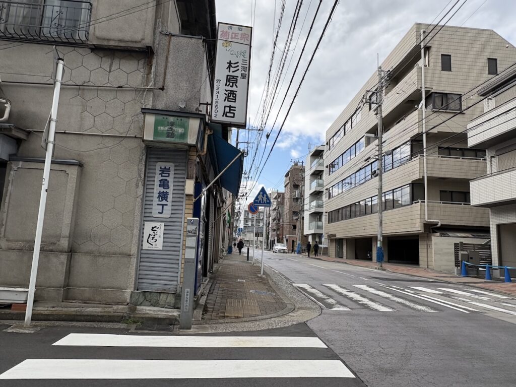 さて、カフェの前を通って岩亀横丁を進むと、信号に。