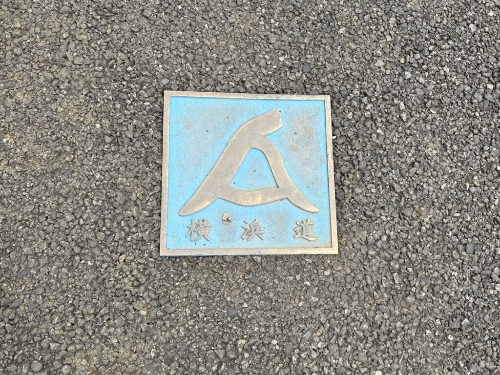 その歩道を注意してみると、所々に「横浜道」のサインが埋め込まれています。