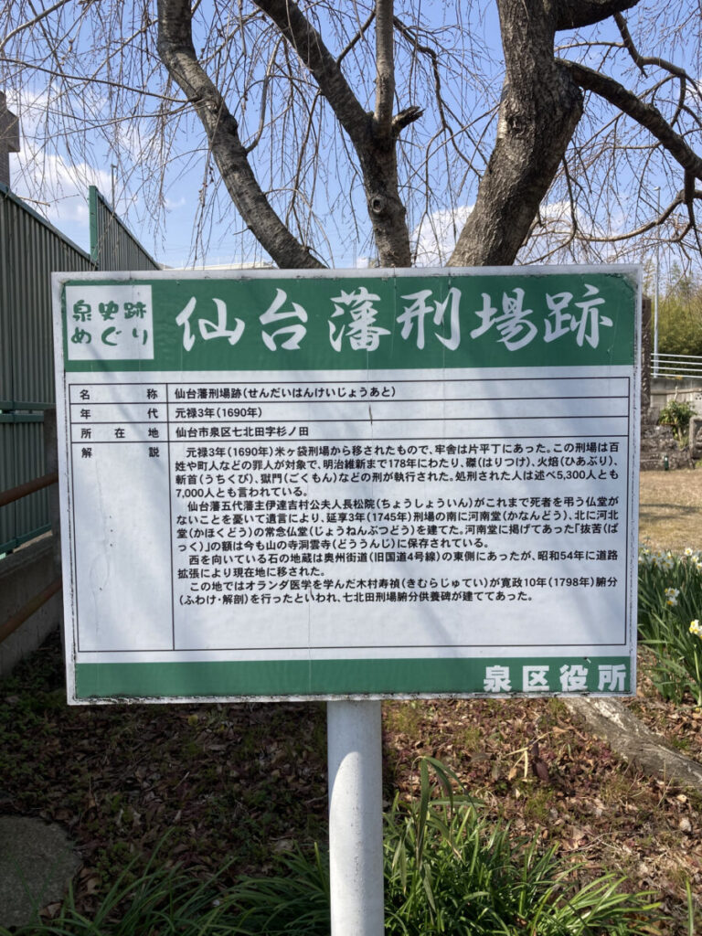 旧仙台藩刑場跡は、仙台結界の中心部として描かれています。結界の大きさは旧仙台藩刑場跡から半径5,6kmとのことだったので、仙台駅はギリギリ入っていないくらいでしょうか。