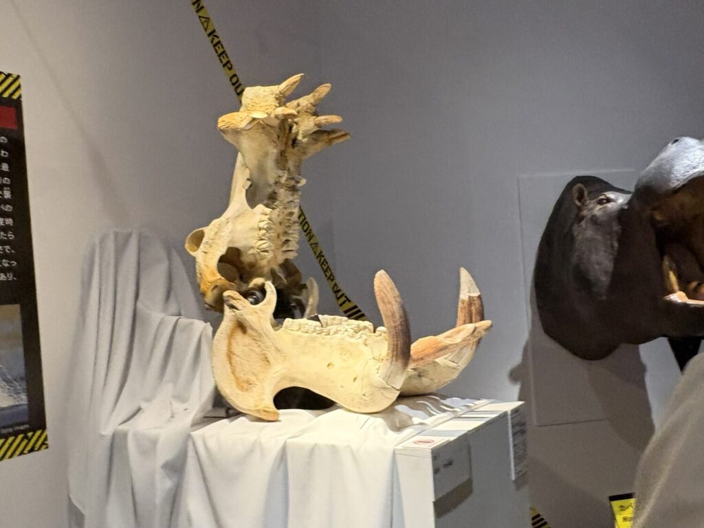 動くカバのアゴの骨格模型からは、アゴの可動域がよく分かり、その危険性がより浮き彫りに。