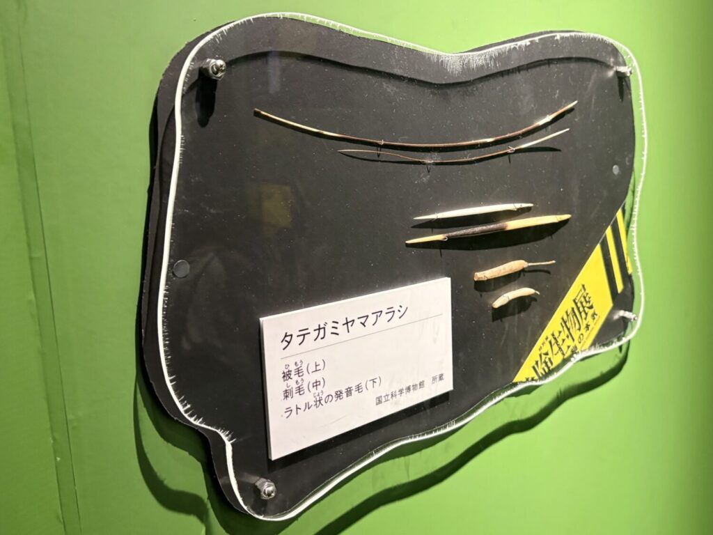 タテガミヤマアラシの刺毛の太さがよく分かる展示も。実際に刺毛が刺さった動物たちの写真は痛々しく、一見かわいらしいイメージのあるヤマアラシの危険性がよく分かりました。