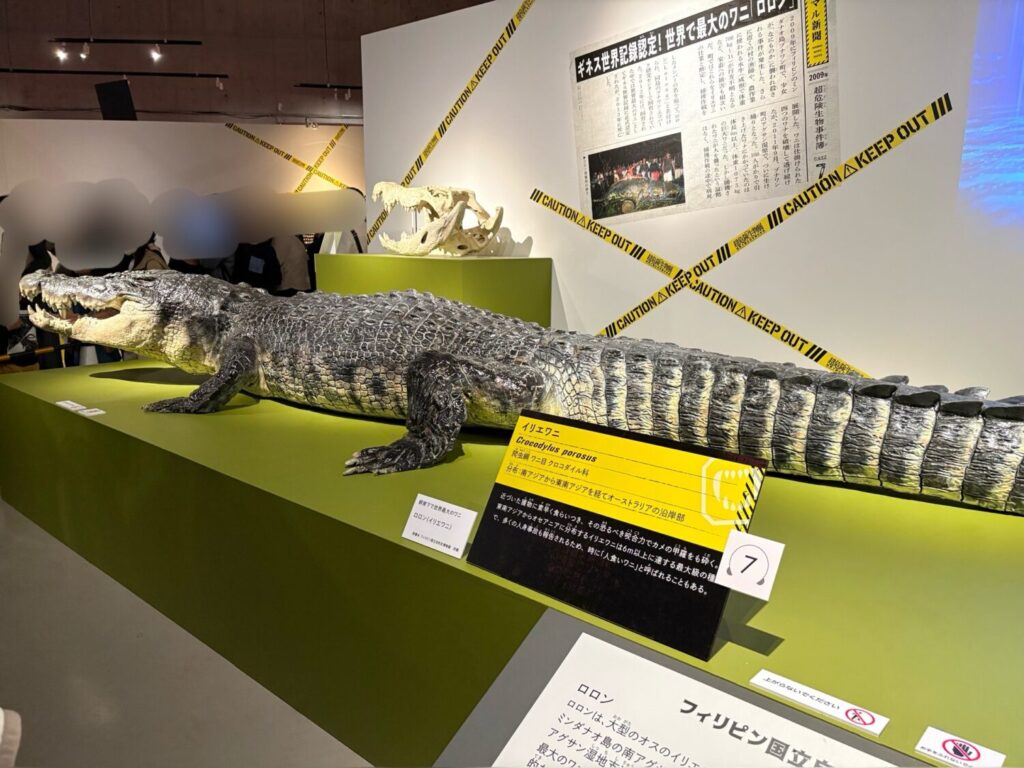 一つ目が、世界最大級のイリエワニ「ロロン」の標本(レプリカ)。ロロンは体長6メートル、体重は1トン以上あったとされ、飼育下で世界最大のワニとしてギネスブックにも登録されています。