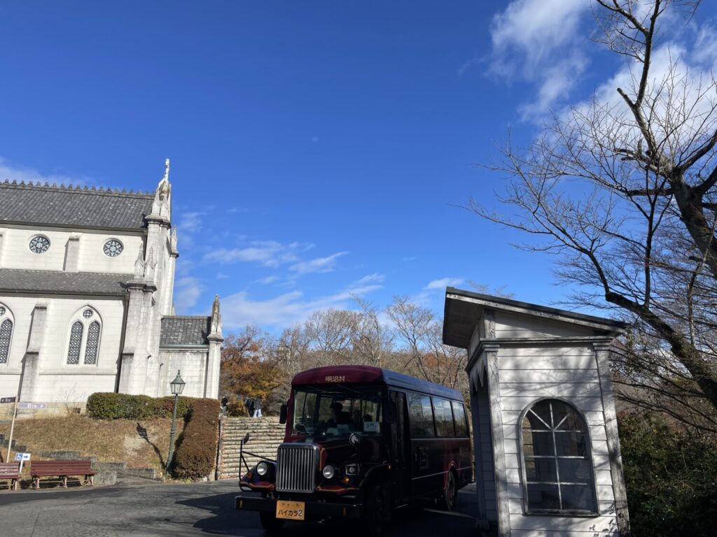 村営バスもとてもかわいい!このバスに乗れば、園内を周遊できます。