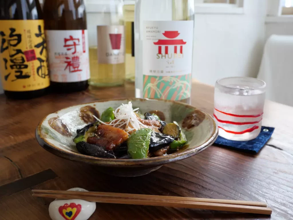 実際に口にすると、泡盛のスッキリとした味わいがピーマンの苦みや黒酢の酸味によく合います。泡盛から感じるお米の甘さで、豚肉ピーマンナス黒酢炒がどんどん進みます。