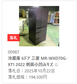 主な出品物は家電製品。冷蔵庫・洗濯機・電子レンジ・テレビなどの大型家電から、小型の調理家電・美容家電まで幅広く取り扱われています。毎週の出品数は300〜500台以上と圧倒的な物量を誇り、仕入れ先として安定感があります。