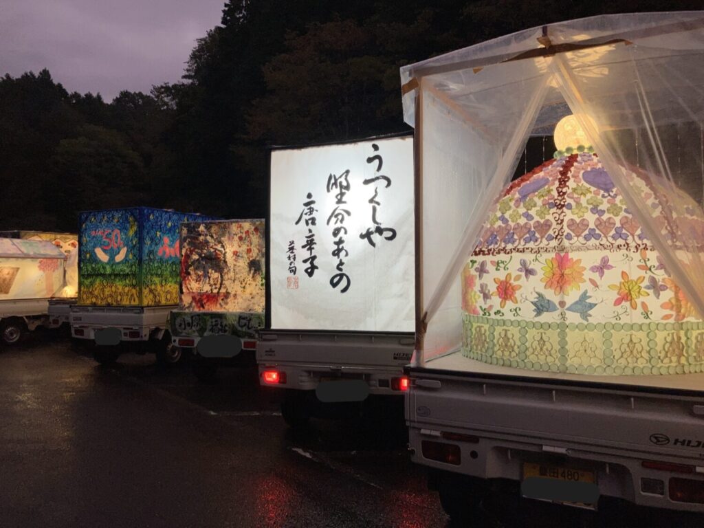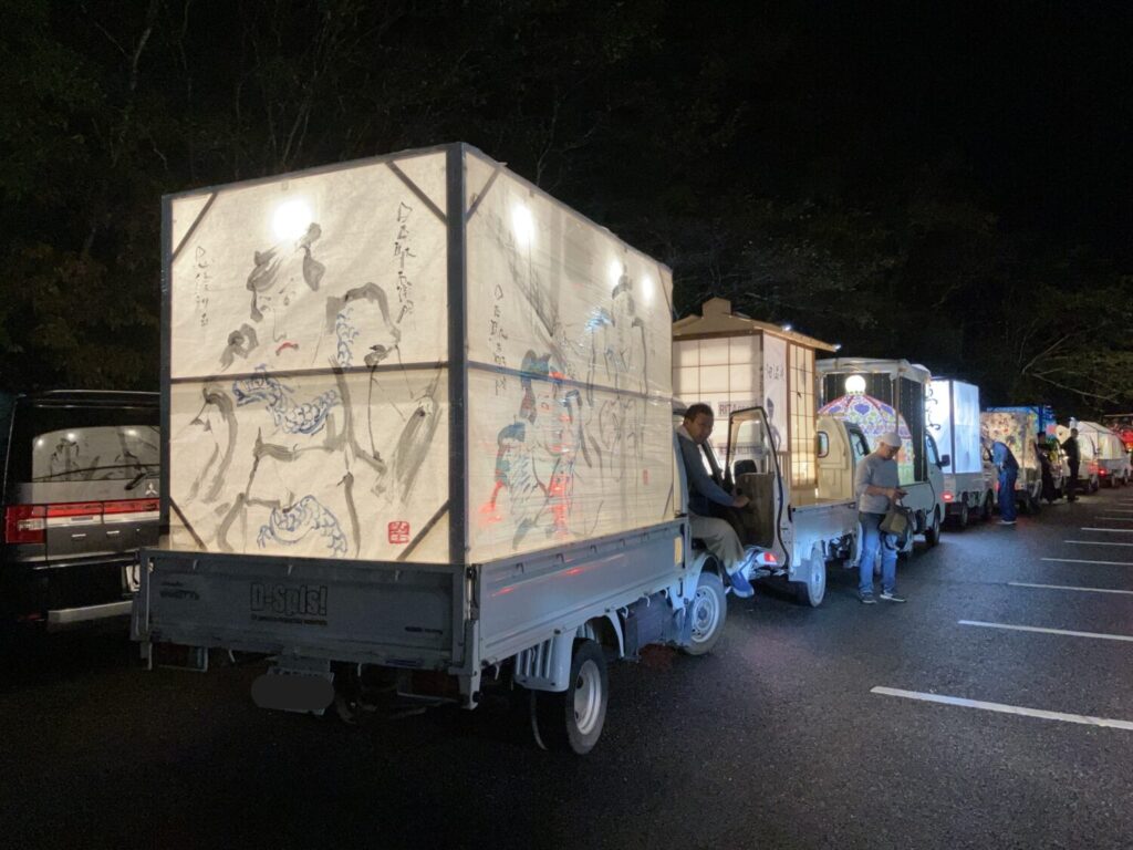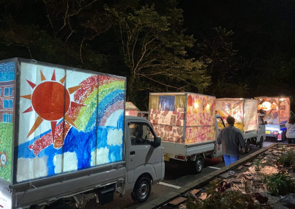 沿道に並ぶ軽トラックはそれぞれの彩り。夕暮れの空に和紙越しの光がにじみ、まわりを温かく包み込みます。