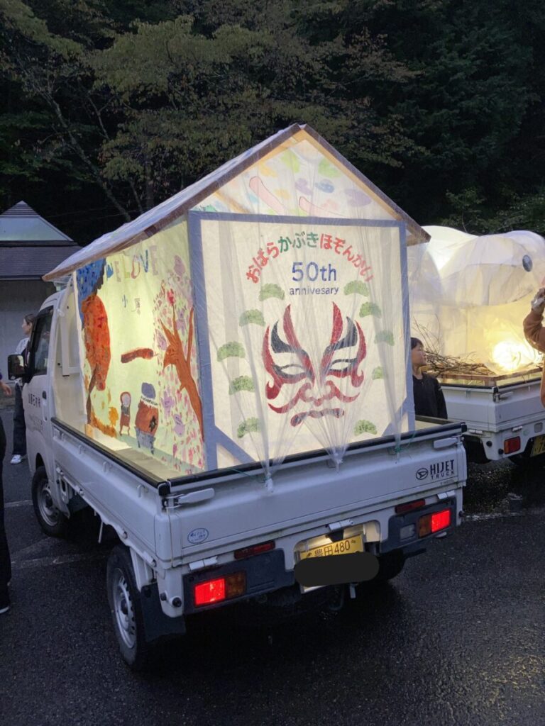 特産品「小原和紙」で作成したあんどんを軽トラックの荷台に乗せ、地区全域をまわる秋のイベント。民家のない山道を中心に、約40キロの行程を20台ほどの軽トラックが一列になって走る。観客にはサイリウムが配られ、沿道で光りとともにトラックを見送る。