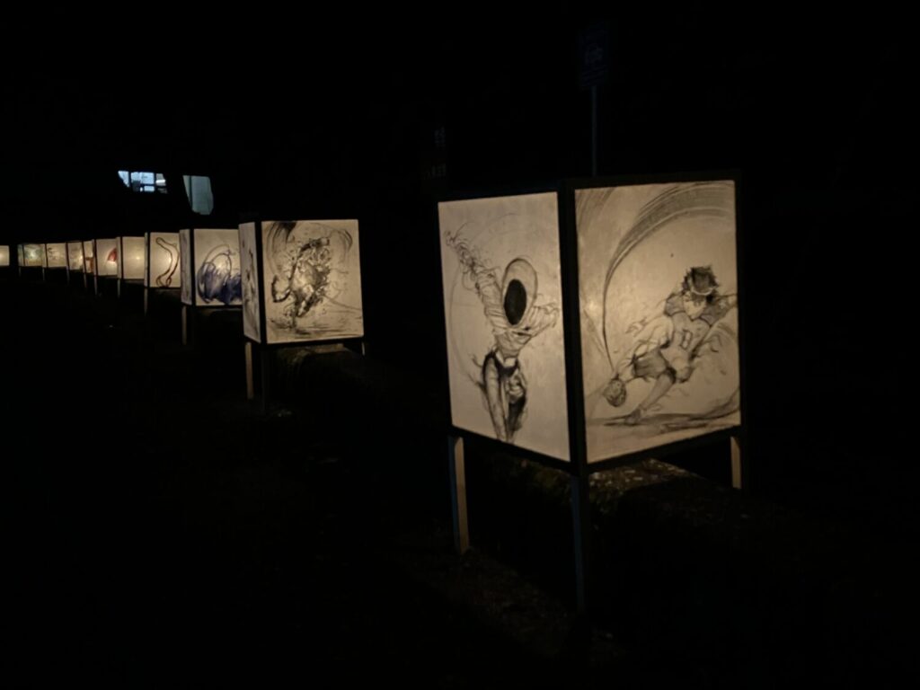 通路には暗い足元を照らすあんどんも設置。愛知工業大学の学生が小原地区を盛り上げるために企画し、親子連れにミニあんどんを作ってもらったそうです。