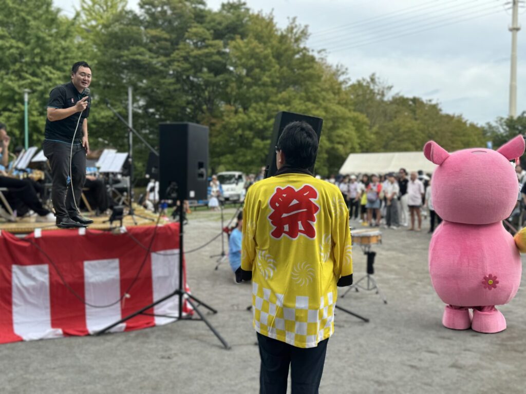 ちょうど会場に到着すると、藤代健吾市長がステージで話していました。すでにステージパフォーマンスが始まっている中だったこともあり、周囲を大勢の人々が囲んでいます。市長の「楽しみましょう!」の声掛けで、会場の熱量がさらに高まったようです。