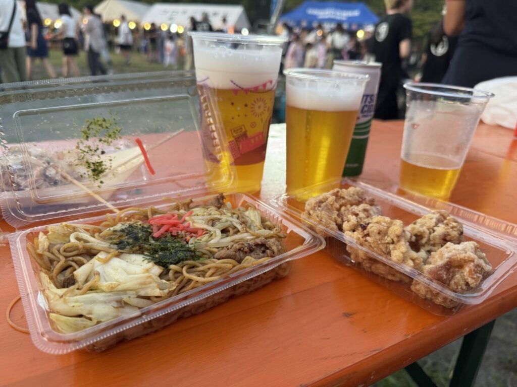 広々とした公園の真ん中には櫓(やぐら)が設置され、その周辺にはテーブルが。そして、公園の端を囲うようにして多くの出店が並びます。立ったままだと食べ物を落としたり人にぶつかったりすることがあるので、落ち着いて飲食できるのは嬉しい配慮です。