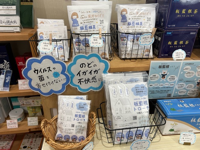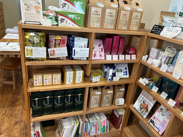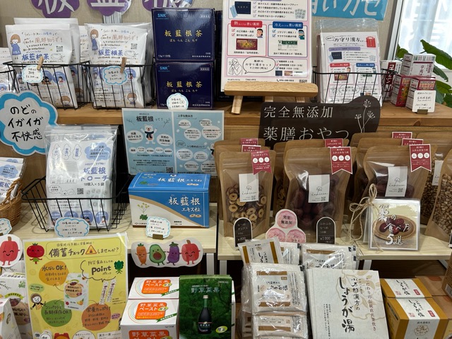 こちらのスペースでは梅こぶ茶などののど飴やくこ茶やはと麦茶などの漢方茶、しょうが湯、スキンケア商品が販売されています。