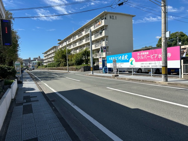 水前寺駅から徒歩10分、近くの熊本高校のグラウンド前にバス停があります。