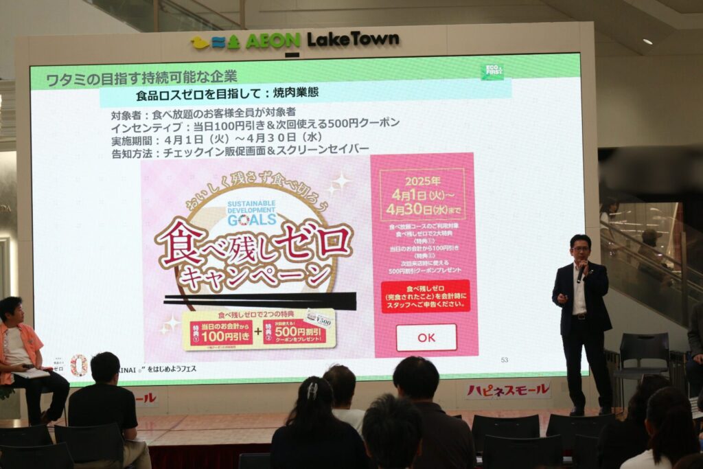 ワタミは食品残さの再利用やメニュー改善など、現場発のアイデアを発表しました。mottECOは、食べきれなかった料理を専用容器で持ち帰る文化を広げ、年間34トンの食品ロス削減を達成したことを発表。TABETEは、売れ残りそうな食品を消費者がアプリを通じて“レスキュー”する仕組みを紹介し、年間約37トンのロス削減と100トン以上のCO₂削減を実現していることを伝えていました。