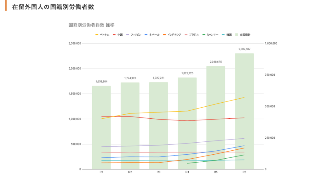 国籍別では、ベトナムや中国が依然として大きな割合を占める一方、近年はフィリピン、ネパール、インドネシア、ミャンマーなどの国々の伸びが顕著だといいます。また、2019年に創設された「特定技能」制度の活用も増加しています。この制度は、人手不足が深刻な分野で外国人の就労を認めるもので、ビザ取得の要件が比較的緩やかであることから、企業と求職者の双方にとって利用しやすい仕組みとして注目を集めています。