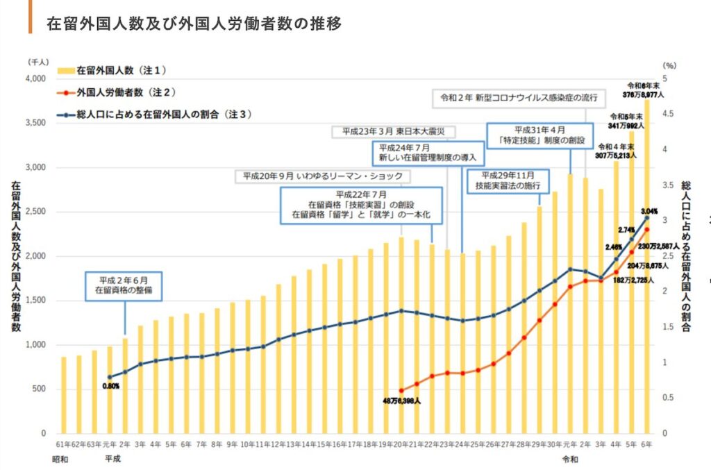 冒頭、行平氏は日本における外国人就労の現状について、最新データをもとに解説。会場では推移グラフを示しながら、年々増加を続ける外国人労働者数について説明し、「在留外国人はすでに約400万人に迫っています。増加傾向にはありますが、総人口に占める割合はまだ3%程度にとどまっている状況です」と語りました。