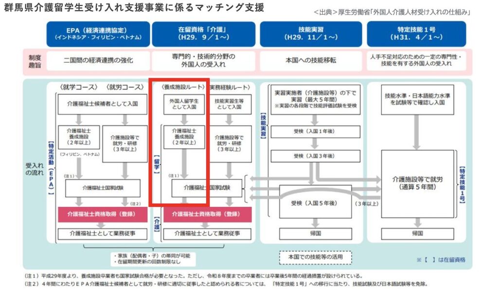 群馬県では、介護福祉士を目指す留学生と介護施設のマッチング支援業務を3年連続で受託。来日予定の留学生候補者や、県内の養成施設に進学予定の学生を対象に、面接から来日後、卒業までを一貫してサポートしています。