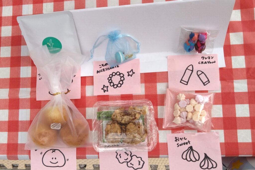 お店では6種類の商品の中から買いたいものをセレクト。何を選んでもOKです。お金は主催者が手作りしたオリジナル紙幣を使います。