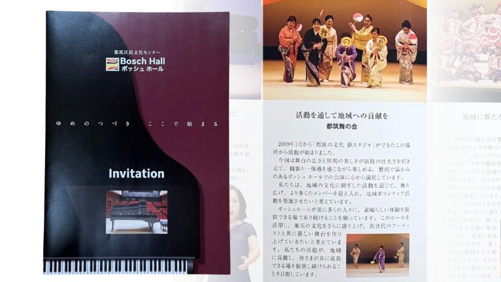 ボッシュホールに入ると「夢スタジオ」の看板が飾ってあります。そして、パンフレットには都筑区の音頭を踊り続ける「都筑舞の会」のみなさんが載っています。
