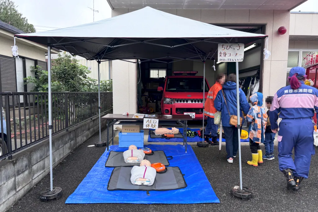 また、熊谷市消防団妻沼分団によるAED・消防コスプレ体験コーナーもあり、興味津々な子どもの姿も。