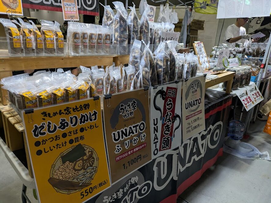 展示会ではペットの連れ込みが禁止されるケースが多いのですが、このイベントではペット同伴OK。最近は愛犬、愛猫とともにアウトドアを楽しむ人も増えていることもあり、会場にはペットフードはもちろん、ペット用のアウトドアチェアやテントなどのアウトドア用品を扱う企業が多数出展していました!