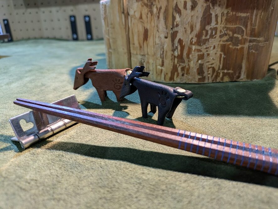 蝶つがいは、2つの板金を組み合わせて、その間に金属の軸を通すことで作られます。ワークショップでは、その工程を利用した箸置きを作りました。箸置きというと動物や野菜など可愛らしいモチーフが多いイメージなので、無骨な金属でできたビジュアルは何だか斬新です。