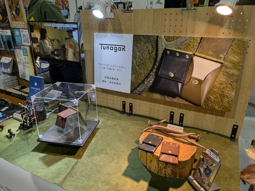 会社のある伊豆市の革製品ブランド「teku」との出会いから生まれた名刺入れは、鹿の革と蝶つがいを組み合わせたスマートなビジュアル。当日はテレビ放送でも商品が紹介されたということで、「テレビを見てカッコイイと思って買いに来た」というお客様もいたそうです。