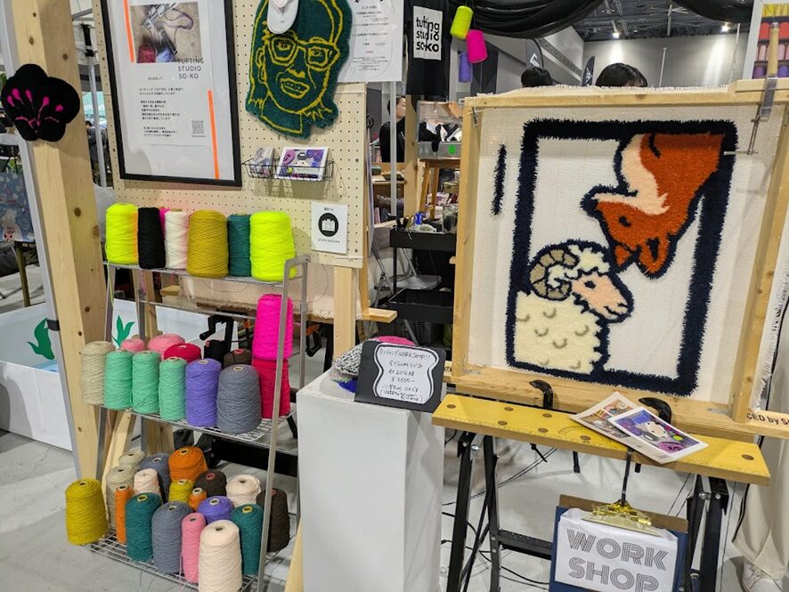 宮本さんは一宮市にある染色工場・小川染色が作る美しい発色の毛糸の大ファン。愛知県からの出展の打診を受けた際、同社との合同ブースとしての出展を持ち掛けたそうです。「アウトドアが好きな層と、自分で作れるカラフルなラグが好きな層は被っていると思う」という宮本さんの予想は見事的中し、当日行われたワークショップは大盛況でした。