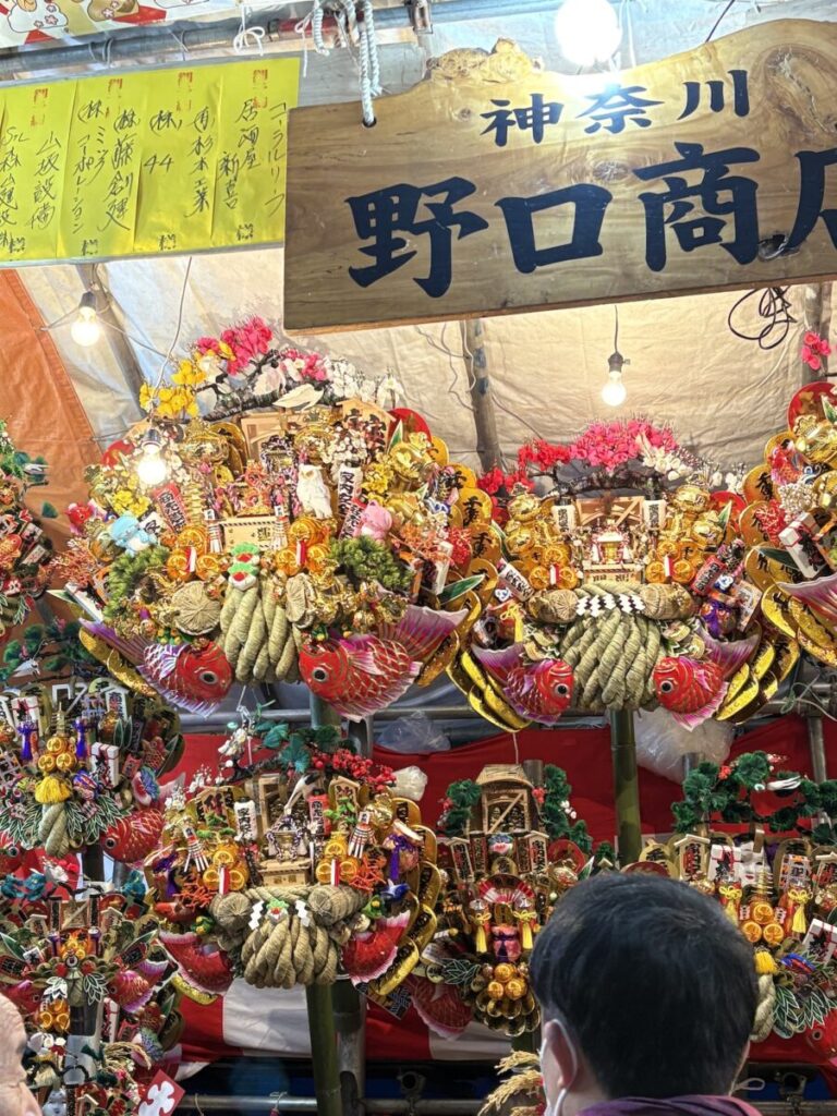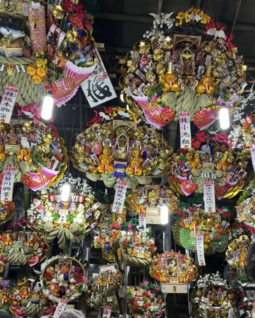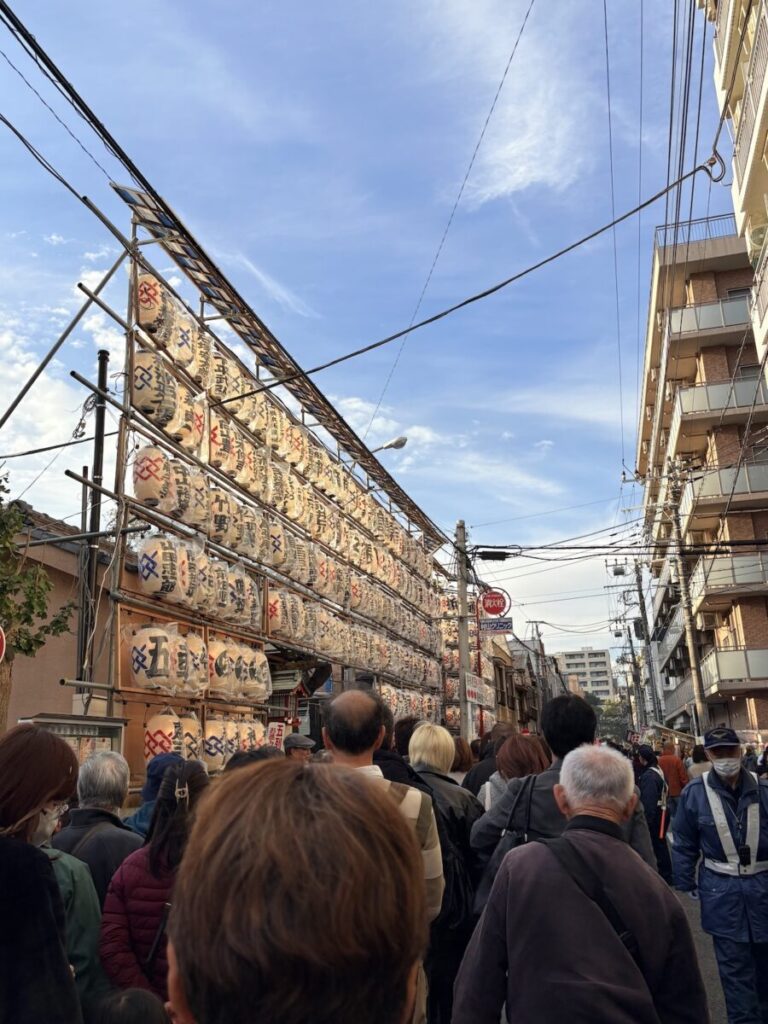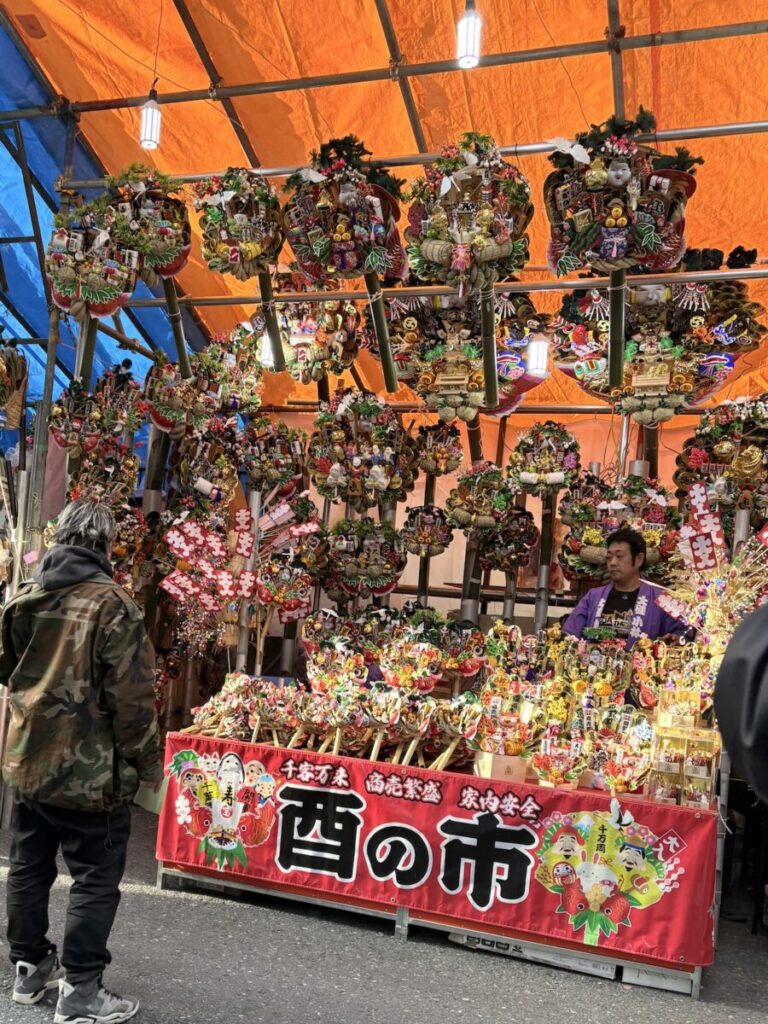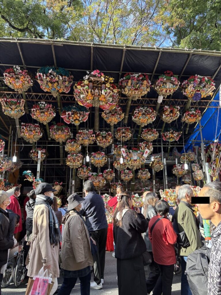 熊手を購入すると、お店の方が威勢のいい掛け声とともに柏手を打ってくれるのですが、薄暗くなっていく街の何処からかこの掛け声が聞こえてくると、神々しささえ感じます。