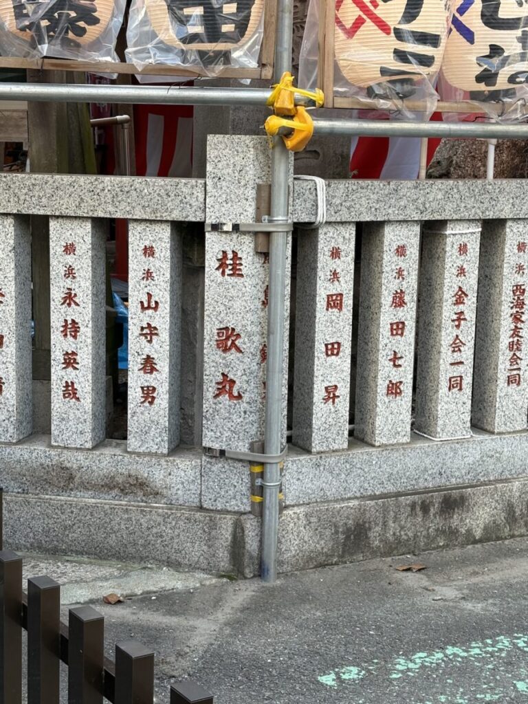 神社の入口には、落語家の桂歌丸師匠の玉垣があります。