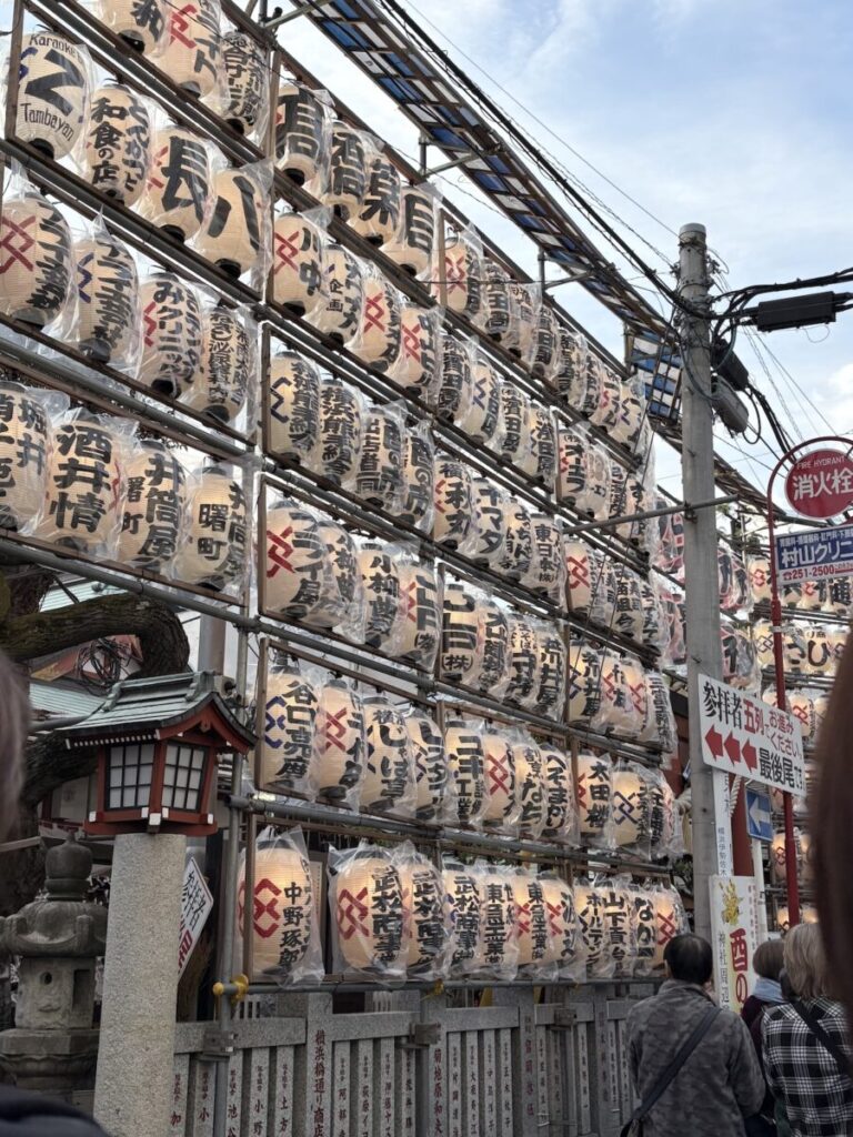 境内にはたくさんの奉納提灯が並んでいます。景色として眺めるには、提灯の灯りが映える夕刻のほうが美しいかもしれませんね。