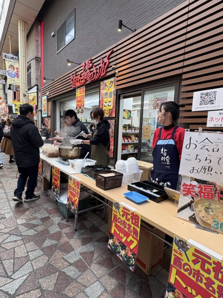 酉の市での食べ歩きと言えば、何といってもこちらの「福美」さんは外せません。商店街の入口近く(大通り公園から見て)にあるキムチ専門店で、酉の市の日には名物「トック」が販売されます。今回は空いていたのですが、例年は並んでいることが多く、お店周辺はトックを食べる人達で大混雑です。