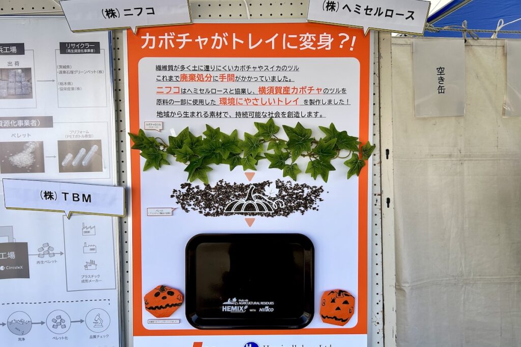 また、出店している各キッチンカーは、料理提供にカボチャのツルで作られたトレイ「カボチャトレイ」を使い、使用後はこのステーションに集められるシステムを採用。システムを採用。
