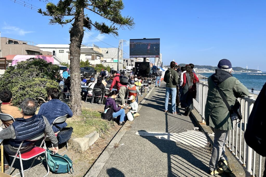 陸上ではわかりにくいレースの展開ですが、大きなモニターを今年は2台設置。ドローンの映像による実況中継と解説を聞くことができるので、初めて観戦する方も楽しめます。