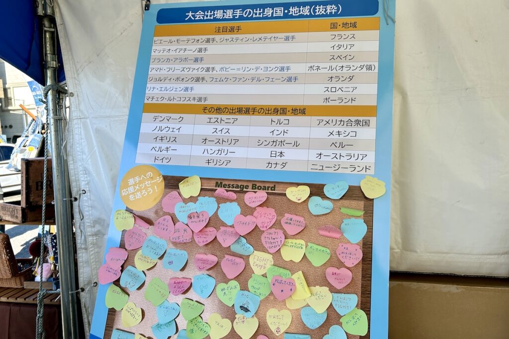 『大会について学ぼう!』と題して、関東学院大学の学生によるパネル展示コーナーが設けられ、大会会場である「横須賀」についての歴史などのほか、出場選手の国について、選手へのメッセージボードなどが並んでいました。