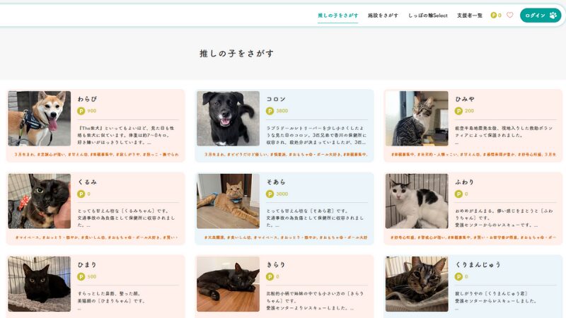ユーザーは、全国の参加シェルターに保護されている犬や猫の中から、応援したいと感じた心惹かれる子を「推しの子」として登録できます。