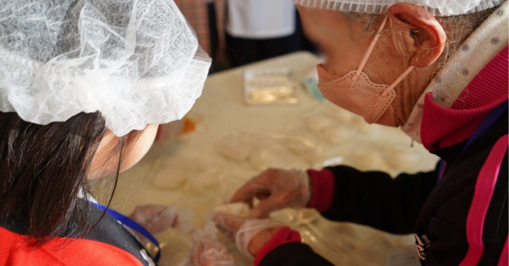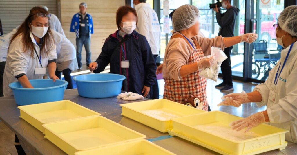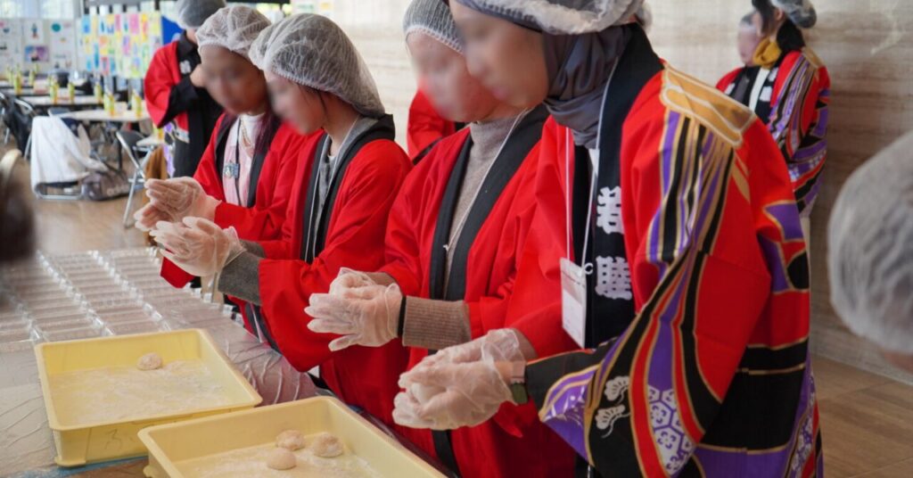 つきあがったお餅は、会話を楽しみながら一つひとつ丁寧に丸められ、その場で食べられるようにパック詰めされました。