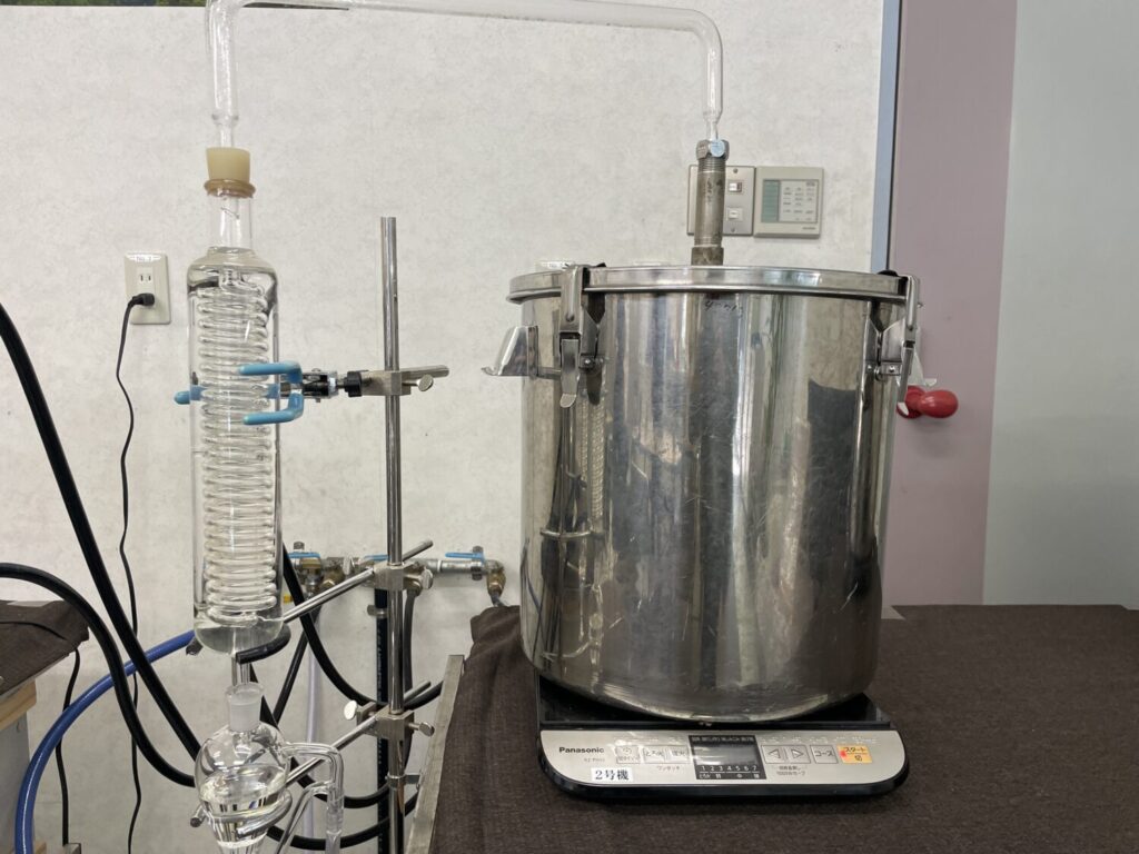山香で行われている蒸留は、手作業を基本に進められています。鍋に原料を入れて蒸し、立ち上がった蒸気を冷却することで、精油成分を取り出すという仕組みです。
