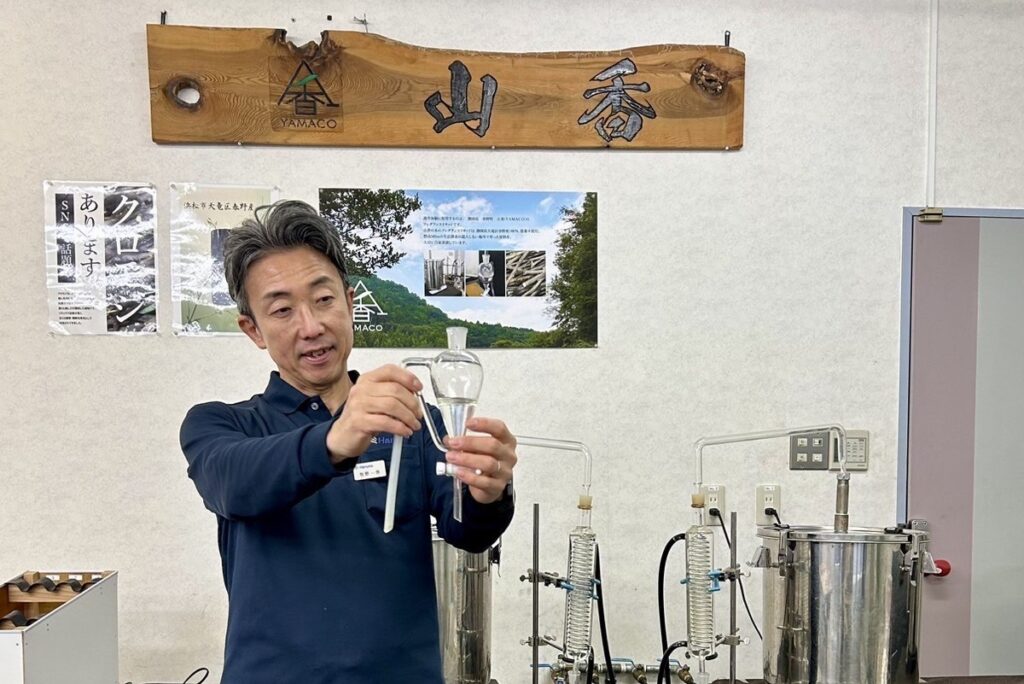 香りは一度に大量に取り出されるのではなく、時間をかけて少しずつ抽出され、精油へと姿を変えていくもの。山香の精油づくりが手間と時間を重ねていることが、自然と伝わってくるようでした。