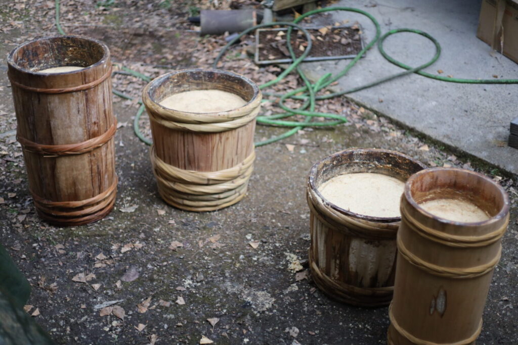 この味噌は、すぐに完成するものではありません。仕込んだ後は、木樽や容器の中で一年ほど眠らせ、時間と微生物に委ねます。