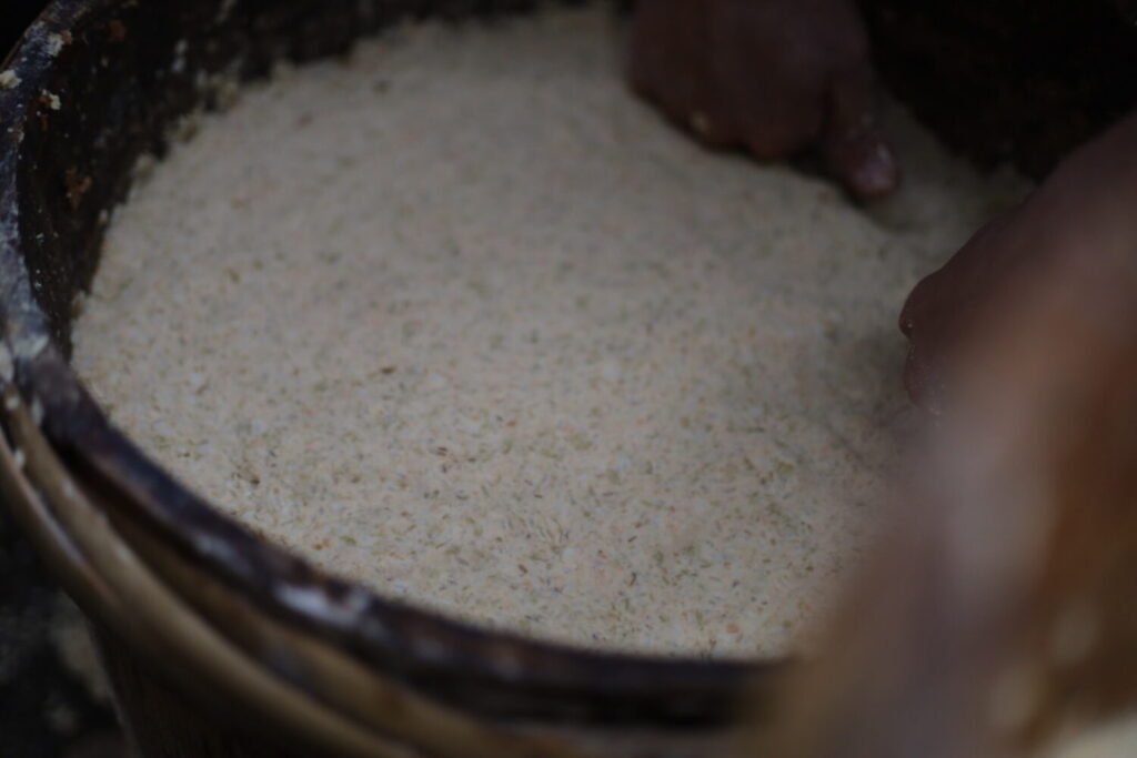 仕込みの工程では、米麹と塩を丁寧に混ぜます。そこに煮上げた大豆を合わせ、手で丸めて空気を抜きながら仕込んでいきます。