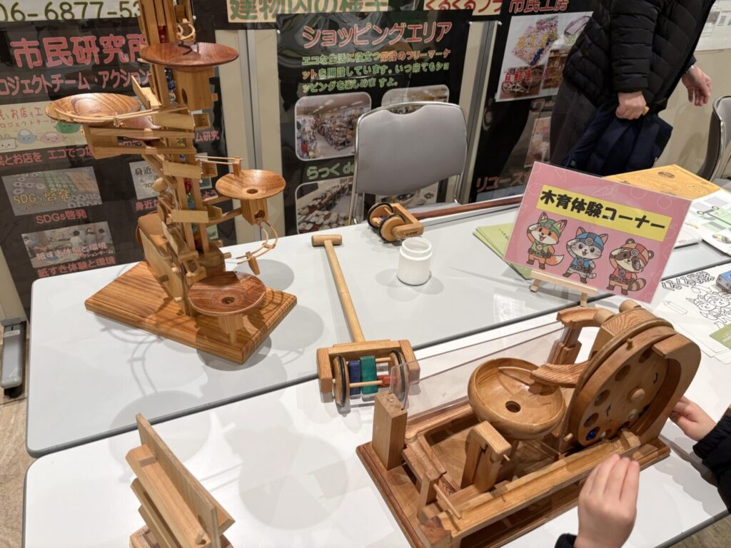 千里リサイクルプラザのブースでは、手作りの木工おもちゃで遊ぶことができる木育体験コーナーがありました。吹田市内にある「くるくるプラザ」の市民工房では、使わなくなった木製の家具などをリメイクする活動も行われているそうです。