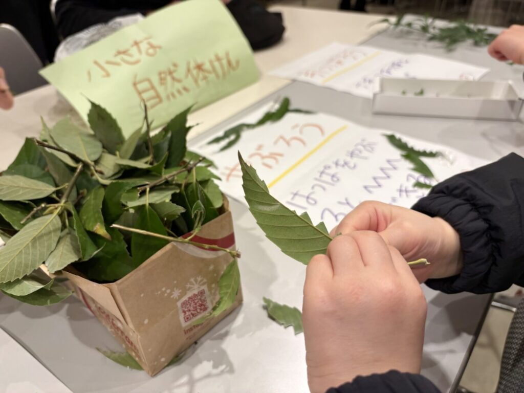 次に向かったのは吹田自然観察会の「葉っぱで作ろう・葉っぱで遊ぼう」ブースです。破るとギザギザに切れる不思議な葉っぱや、磨くとピカピカになる「シリブカガシ」(吹田市内にある万博公園で採取されたそうです)というどんぐりを実際に触ることができました。