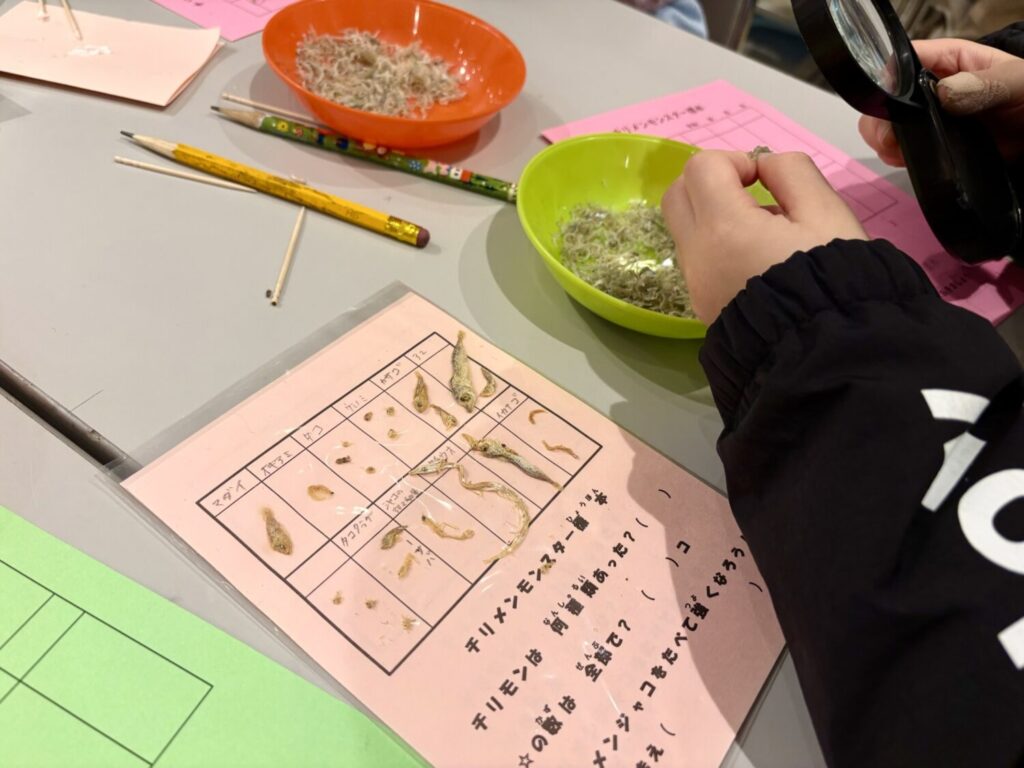 子ども達に特に大人気だったのが、ガールスカウト大阪府第21団による「ちりめんモンスターを探せ」のコーナー。ちりめんじゃこ用カタクチイワシの幼魚に混じっている様々な種類の幼魚を探して、オリジナル標本をつくるというものです。このためにイベントに来るリピーターもいるほどだとか…!参加者は虫眼鏡を使って夢中でちりめんモンスターを探していました。